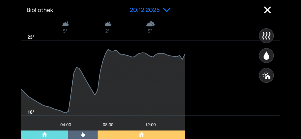 Ich kann mir pro Raum halt den Temperaturverlauf des Tages ansehen. Finde ich interessant, denn ich liebe Zahlen, Daten und Fakten. Wie war es denn gestern? Schauen wir mal was passiert, wenn ich den gestrigen Tag auswähle:
